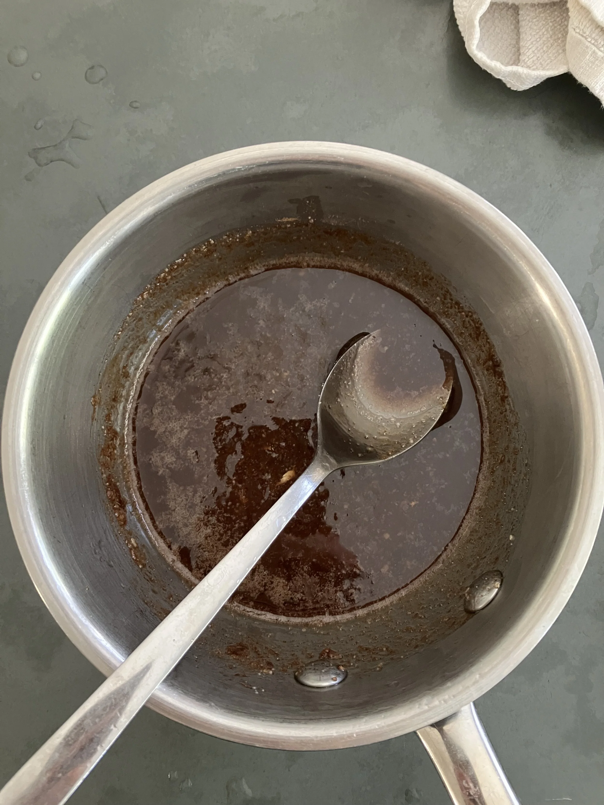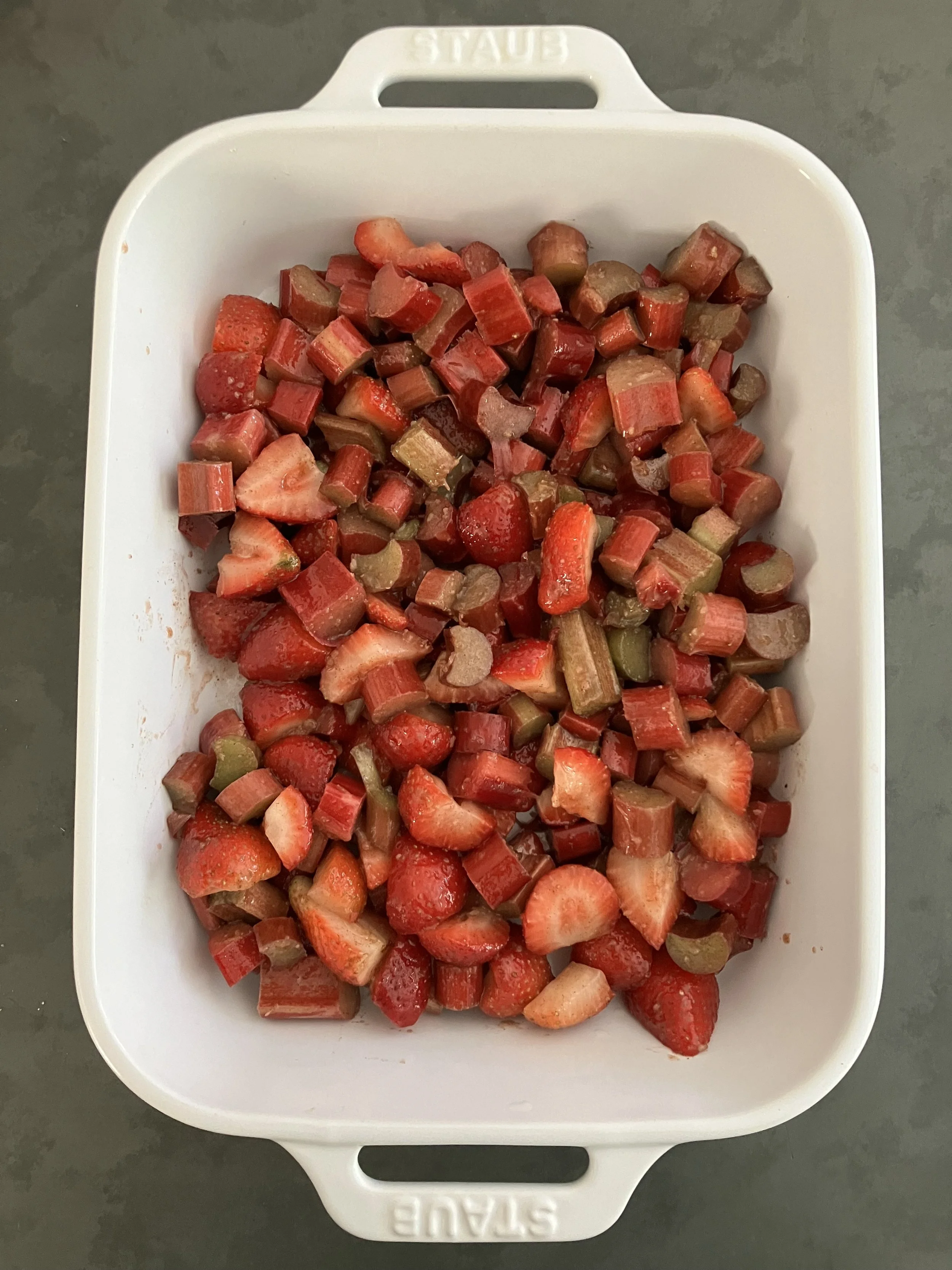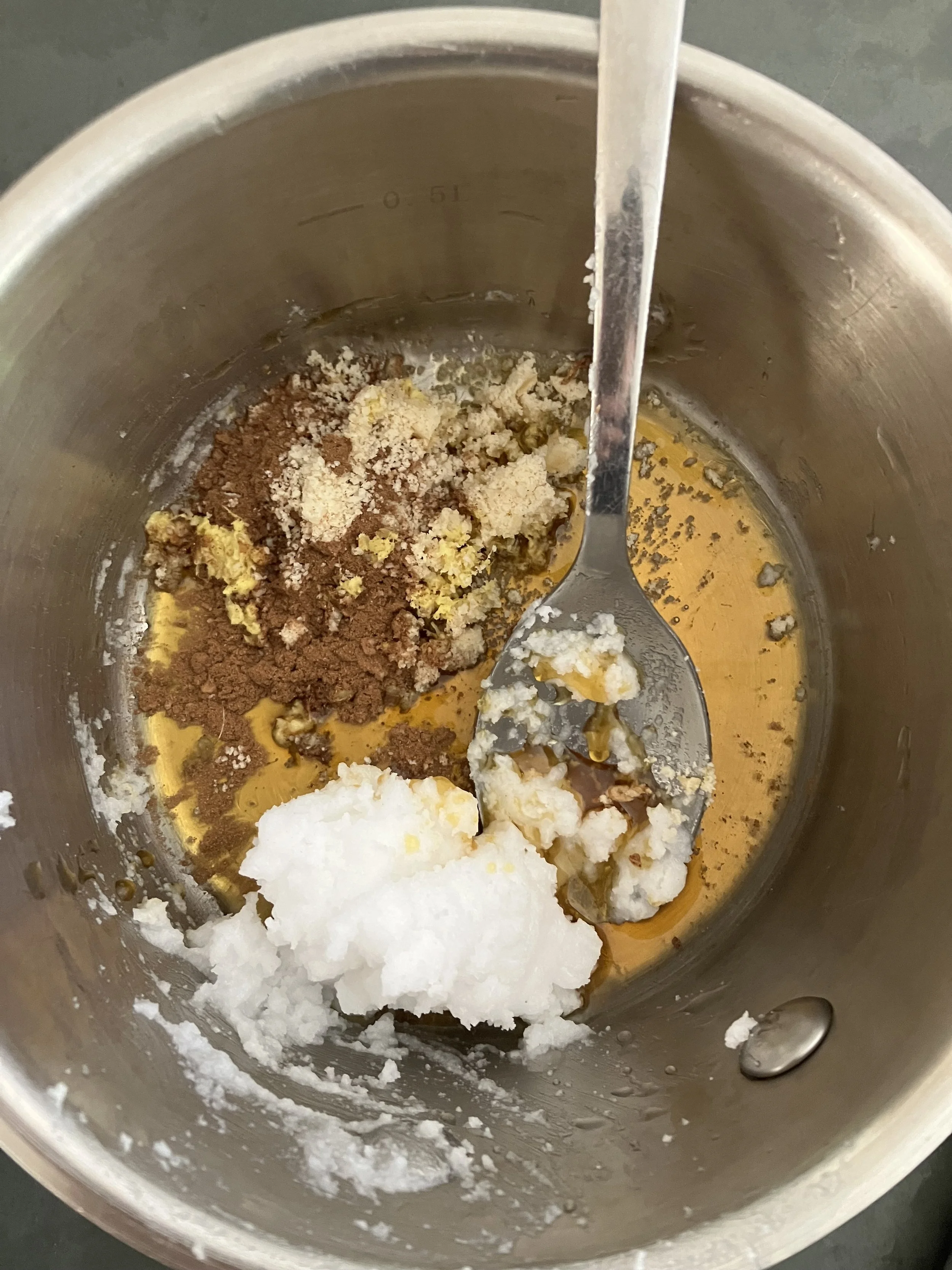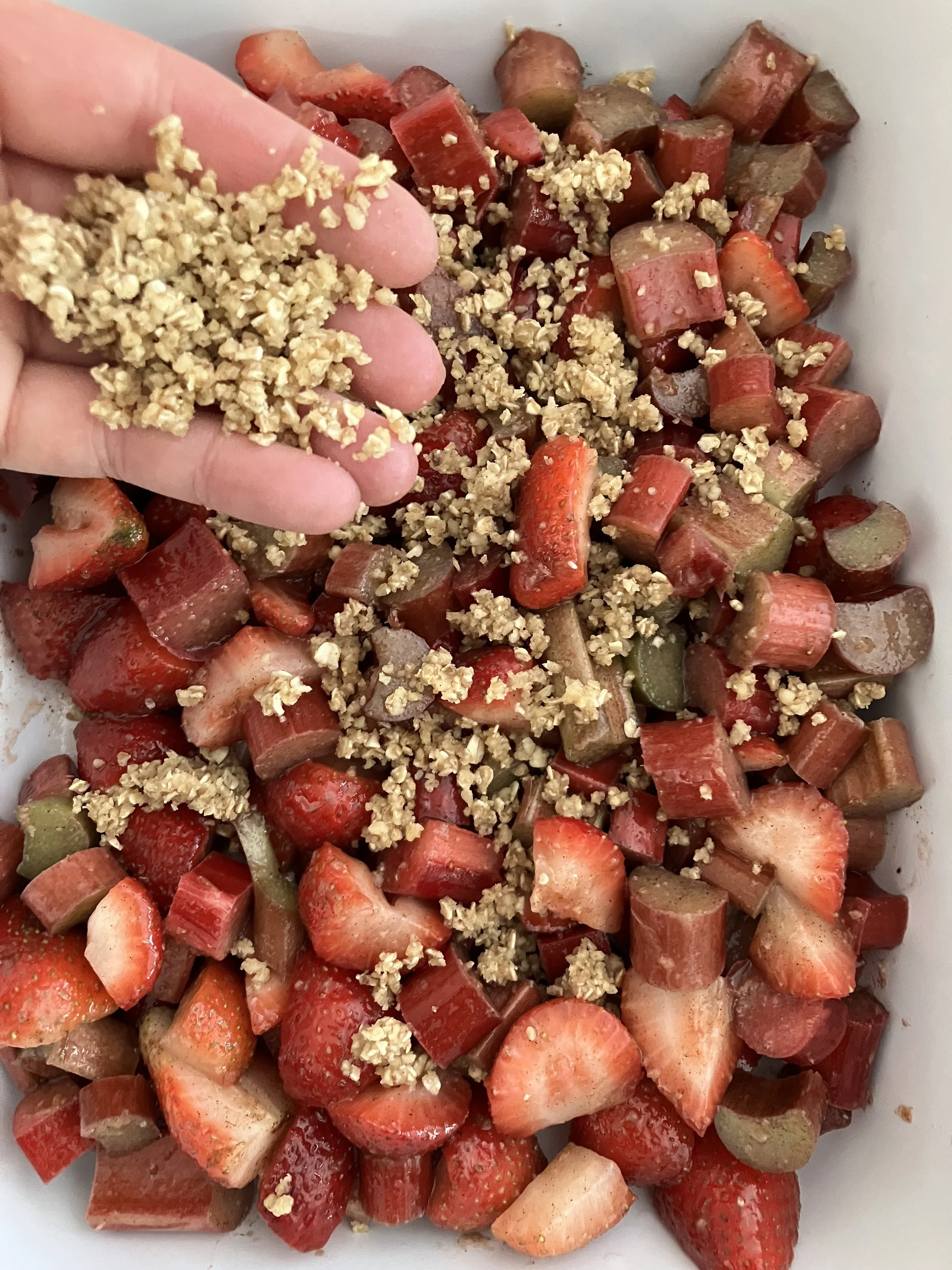 Mix, then stew the fruit ingredients in a saucepan. Simmer on medium, stirring occasionally. You can skip the stew part especially if you’re using a soft fruit like strawberries, and just melt down the coconut oil with the spices on the stove. If using a tougher fruit like apples, stewing everything might be a good idea to soften it all first. Remove from heat and pour the fruit mixture into the bottom of an 8x8 (approx.) baking tray or something similar.