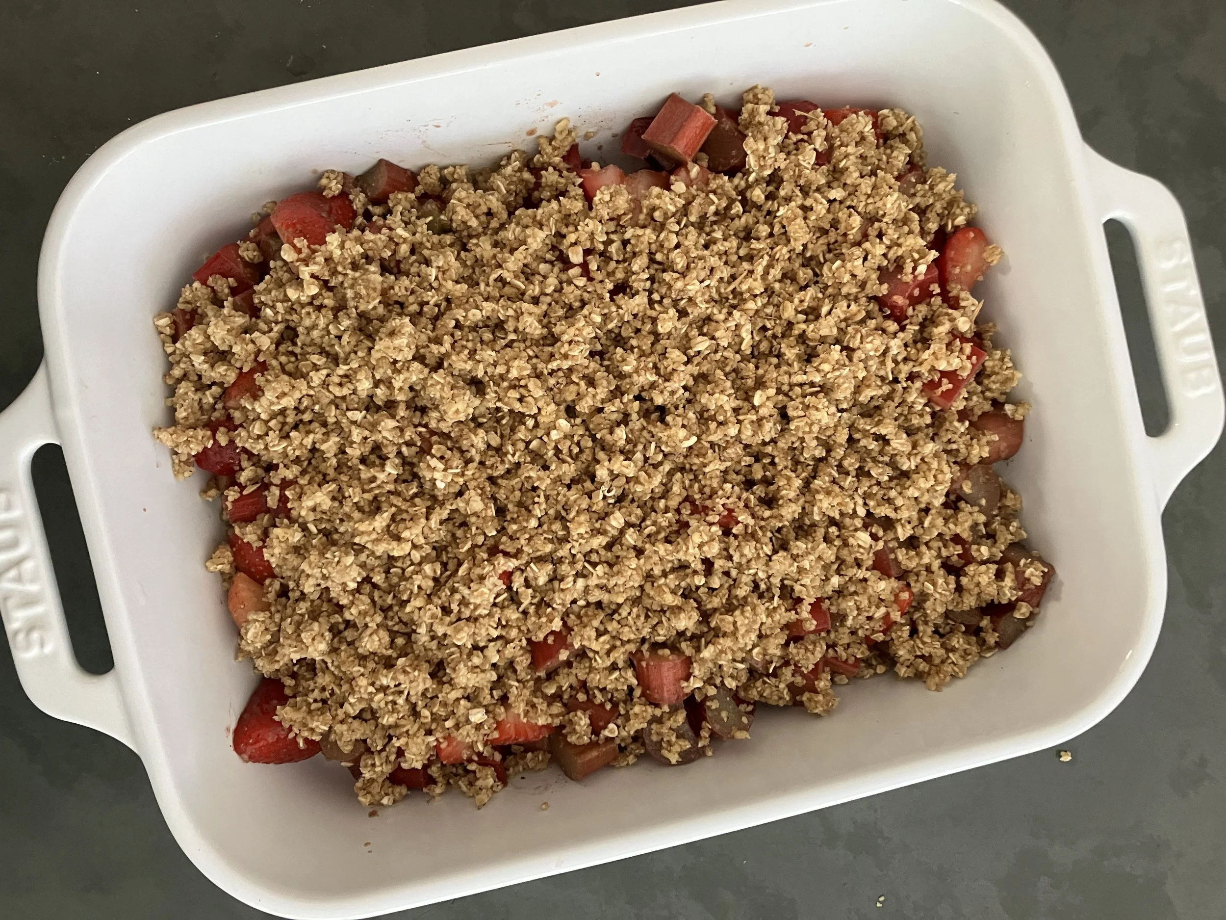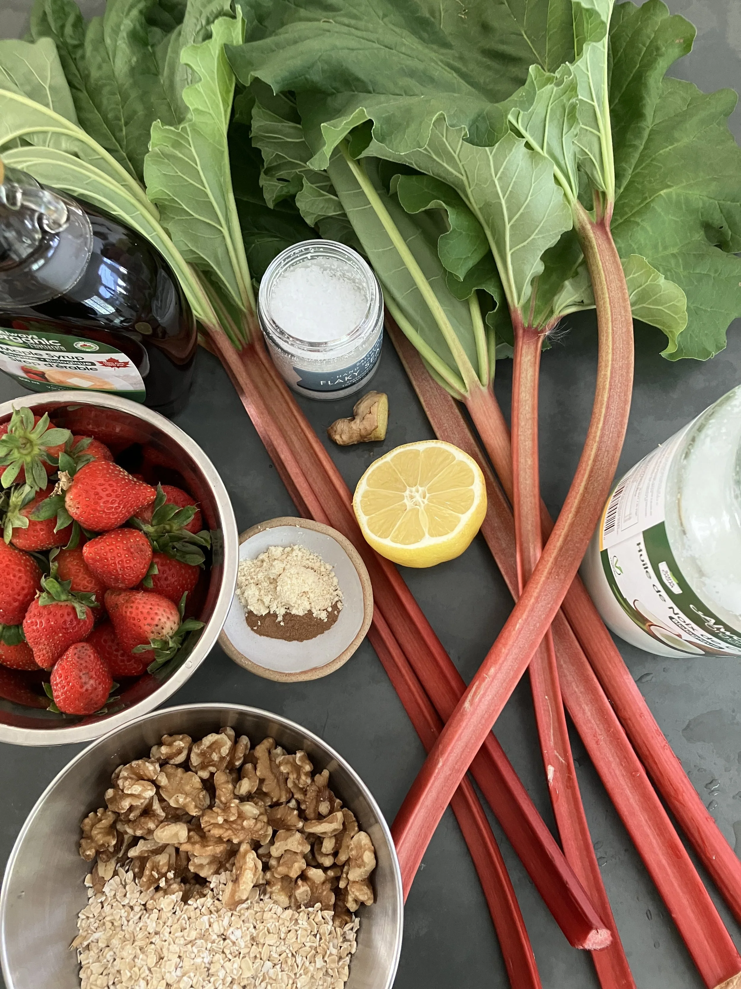 My parents have a giant rhubarb plant that comes up every spring, and there’s always something to make with it every season. This crumble is one such recipe. It utilizes tart flavours that contrast with the sweetness of maple, just like the nostalgic sugar dipped rhubarb that many enjoy, but way less caustic than refined sugar. Enjoy this wholesome crumble with a big scoop of pure coconut yogurt or homemade raw/grass fed ice cream.